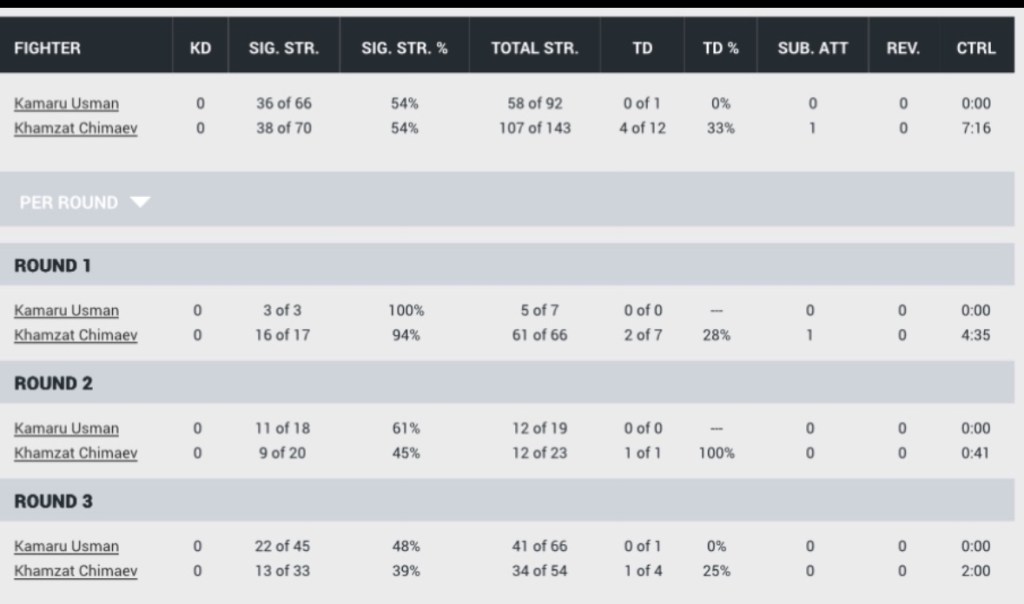 After a 10-8 round for Chimaev in the first, Usman settled in and gave Chimaev a competitive fight. Chimaev’s 33% takedown percentage against Usman is the lowest among middleweight champions in his nine UFC fights, and he was outstruck and arguably won rounds two and three. The ability of Usman to take that fight on ten days’ notice, in Abu Dhabi, at a higher weight class, against a naturally bigger fighter, was extremely impressive.