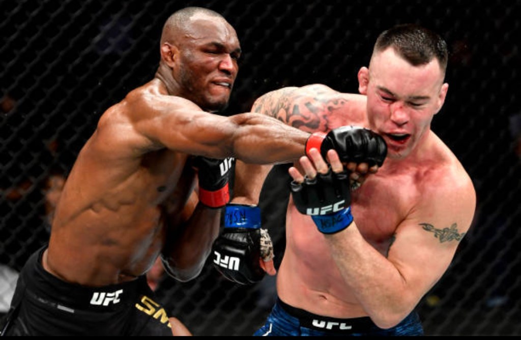 LAS VEGAS, NEVADA – DECEMBER 14: (L-R) Kamaru Usman of Nigeria strikes Colby Covington in their UFC welterweight championship bout during the UFC 245 event at T-Mobile Arena on December 14, 2019, in Las Vegas, Nevada. (Photo by Jeff Bottari/Zuffa LLC via Getty Images)