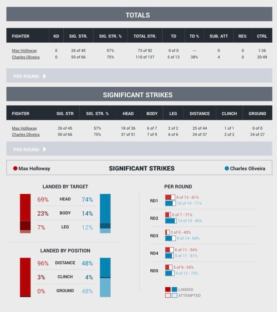 The BMF belt has produced some exciting fights, but Holloway vs Oliveira did not deliver the same level of action, and people are throwing a tantrum because they didn’t get what they wanted. Many have criticized Charles Oliveira’s performance at UFC 326 because of his grappling-heavy approach, deeming it unworthy of a BMF title. In reality, there is one reason this fight was not as entertaining as expected. Max Holloway is not on the same level as Charles Oliveira. Heading into this fight, every fighter, fan, and analyst believed Max Holloway and Charles Oliveira were two fighters of a similar caliber. The truth is, Charles Oliveira is a much complete and more well-rounded Mixed Martial Artist than Max Holloway. For twenty-five minutes, Oliveira completely outclassed and dominated Max Holloway. Charles Oliveira had a whopping 20:49 of control time on the ground. That time amounts to over four rounds of ground control. On the feet, Charles Oliveira was also dominant, nearly landing double the amount of significant strikes as Holloway, with a 50-26 advantage. It was actually shocking how noncompetitive this fight was.